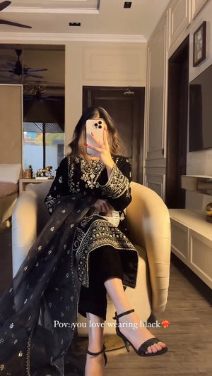 ✨ Because black is not just a color, it’s an emotion. Adorned with intricate golden embroidery and paired with a delicate organza dupatta for a royal festive look.