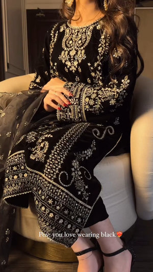 Yes, it comes with a matching black organza dupatta with golden embroidery.4. What type of embroidery work does it have?