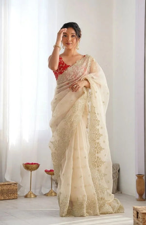 Off-White Organza Embroidered Saree – Elegant Party & Festive Wear