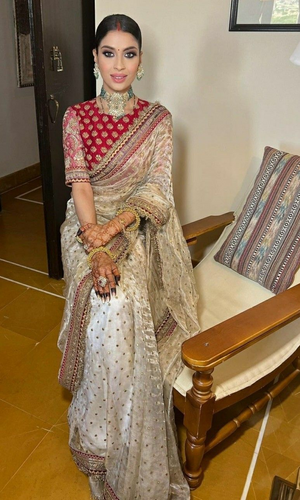 The highlight of the ensemble is the contrasting red embroidered blouse, detailed with zari and floral motifs